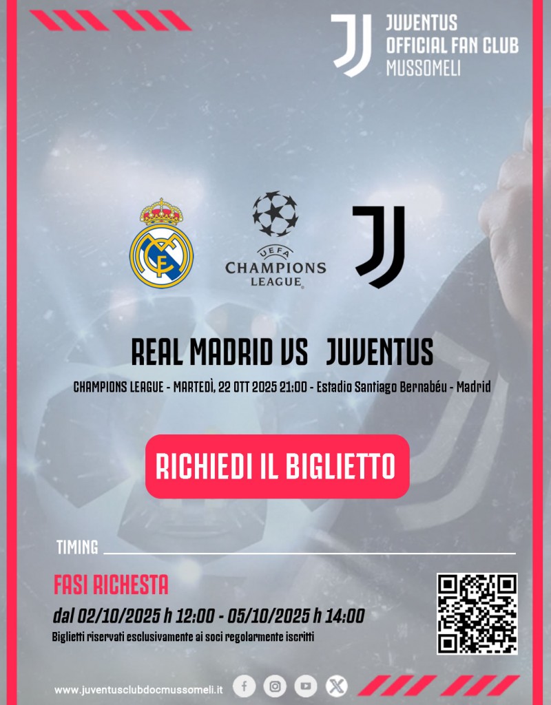 Consigliamo i soci del Club di attendere la comunicazione da parte dello Juventus Official Fan Club Center contenente la conferma del o dei biglietti prima di effettuare qualsiasi tipo di prenotazione viaggio soprattutto considerando la limitata disponibilità di tagliandi.